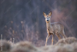 Roe deer, capreolus capreolus, approaching on field in autumn with copy space. Female mammal looking on glade. Doe walking in fall environment with space for text.