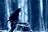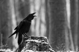 Common raven, corvus corax, croaking onstump in wintertime nature. Dark large bird sitting on cut tree in woodland. Black feathered animal calling on wood.