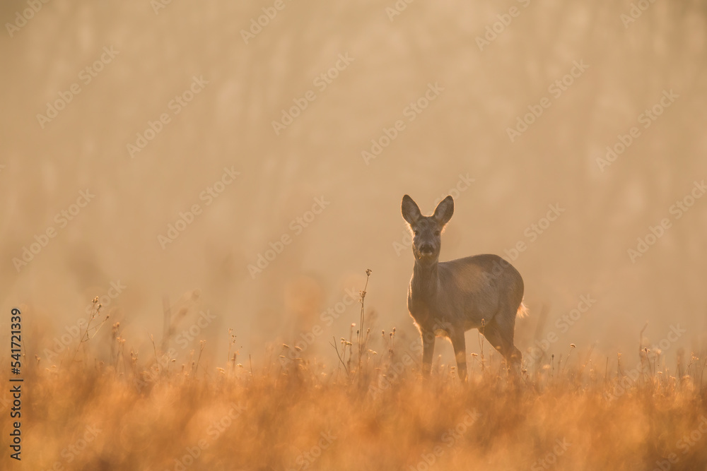 Roe deer, capreolus capreolus, looking to the camera on field in golden hour. Hind standing on grass in autumn in sunset. Female mammal watching on glade with copy space.
