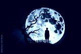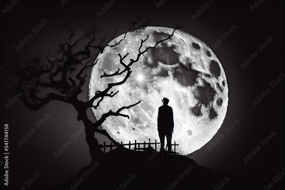 A silhouette in the night. Alone in the light of the full moon with a dead tree. Mysterious and terrifying atmosphere.