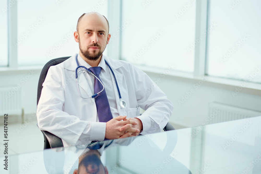 doctor with a stethoscope sitting at a desk.