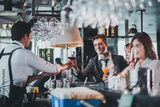 People celebrating a meeting sit and drink wine at a restaurant bar.Smiling woman sitting at a bar drinking cocktails.People celebrating a meeting sit and drink wine at a restaurant bar.
