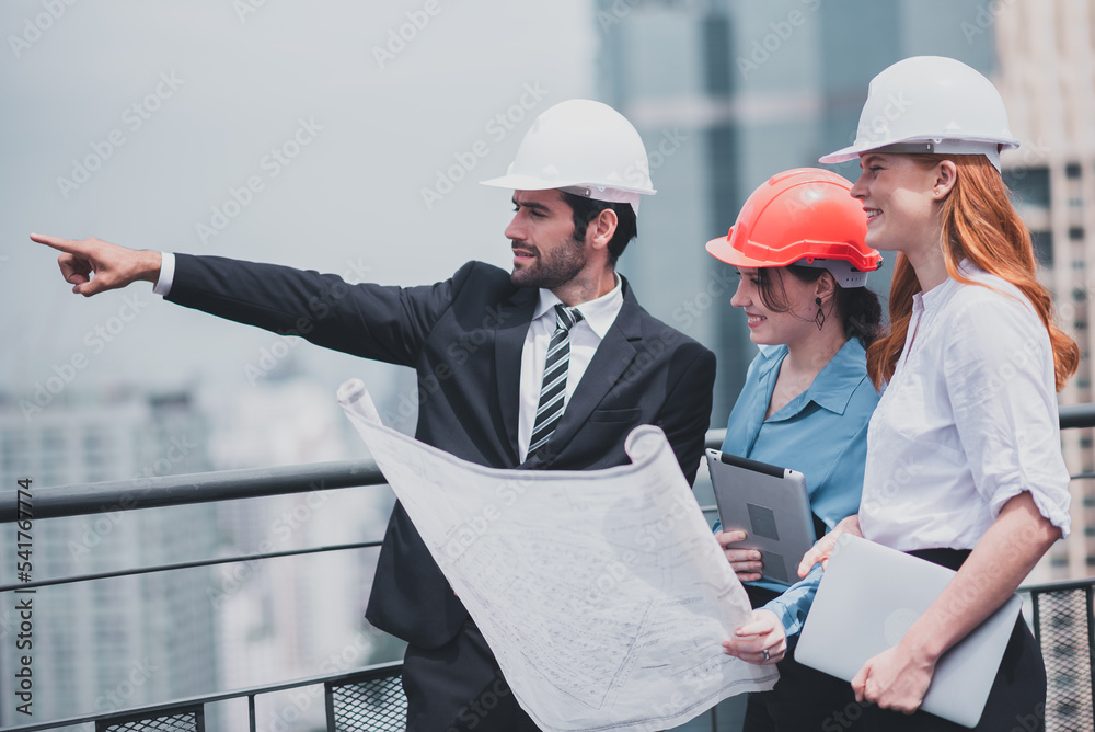 talk teamwork with colleagues for success.Communication female architect work with female engineer partners.Architects are confident in the construction of architecture.