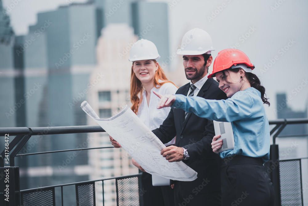 talk teamwork with colleagues for success.Communication female architect work with female engineer partners.Architects are confident in the construction of architecture.