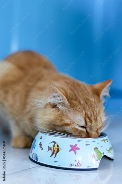 Red kitten eats food from a bowl.