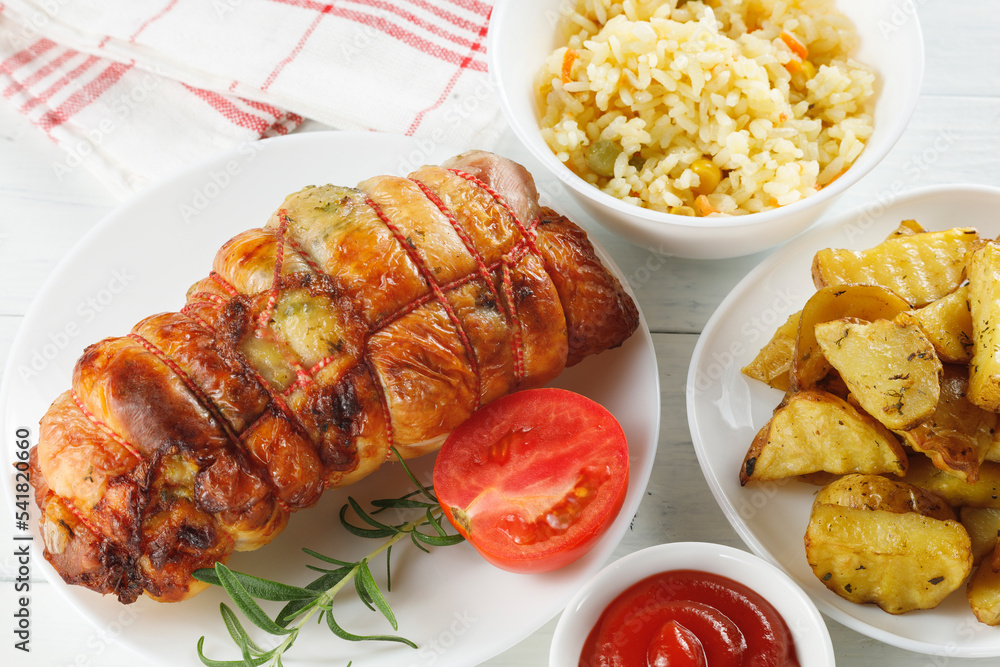 boneless meat roulade with seasonings and garnish.