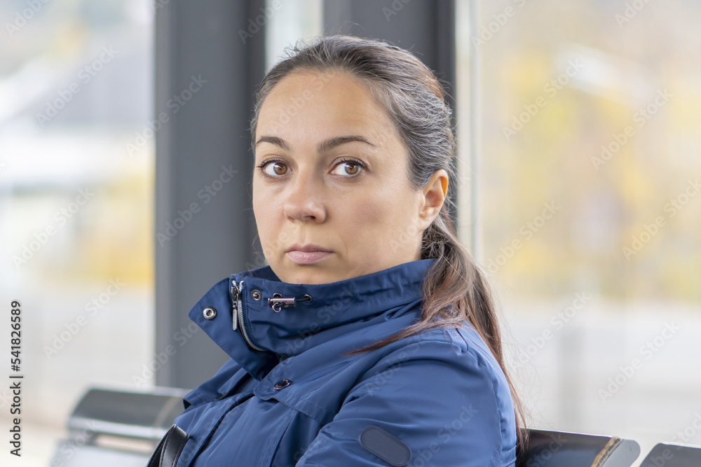 Portrait of a pensive woman 40-45 years old, sitting in a glass bus stop, waiting for a bus, looking away.