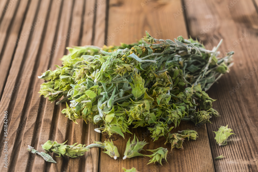 Bunch of dried green ironwort (Sideritis) twigs, also known as Mountain tea - traditional herbal tea in Greece