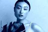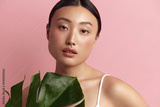 Skin Care Woman Posing with Green Leaf. Asian Model Holding Tropical Plant and Looking At Camera. Female With Nude Makeup, Smooth, Hydrated And Glowing Skin. Natural Beauty On Pink Background