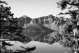 Black and white image of the Wizard Tower in Crater Lake, Oregon. The crystal clear water creates a mirror reflection of the island and the surrounding crater wall.