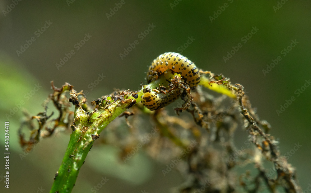 Yellow caterpillars eat leaves.Garden pests.Protection of plants from pests.Crop loss.