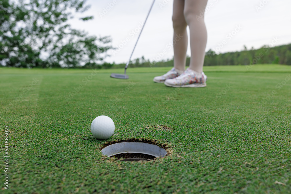 woman golf player putting successfully ball on green, selective focus blur background and clear sky