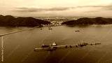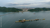 oil tanker ship loading in port, Oil tanker ship under cargo operations on typical shore station with clearly visible mechanical loading arms and pipeline refinery zone