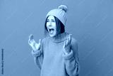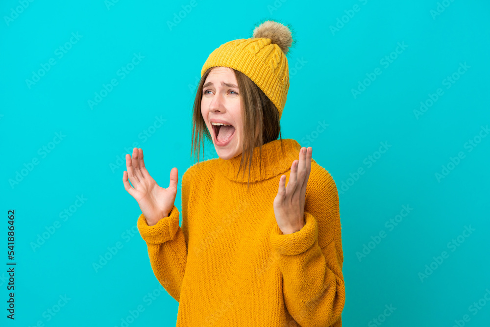 Young English woman wearing winter jacket isolated on blue background with surprise facial expression