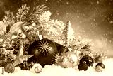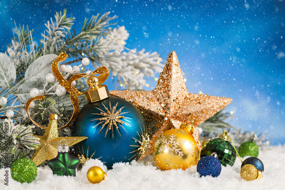 Christmas and New Year decor. Christmas balls, gold stars, snowy fir branches in snow background. Winter holiday greeting card.