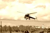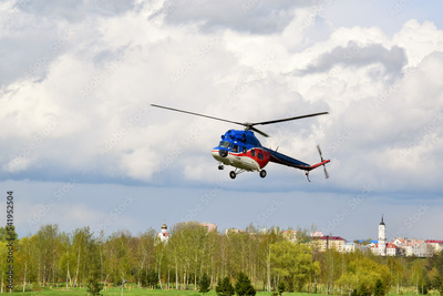 a small helicopter takes off from the field in the city