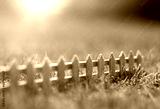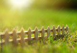A small decorative fence on the green grass in the rays of the sun. Miniature garden fence for the interior.Landscape design.
