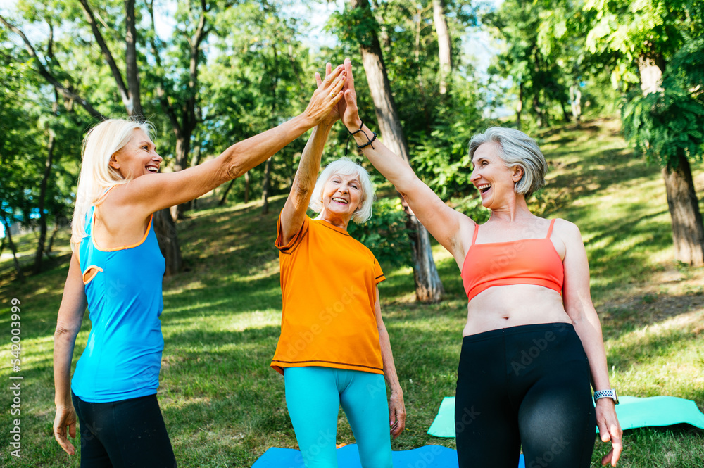 Active senior women doing fitness in a park - Sportive old people training outdoors