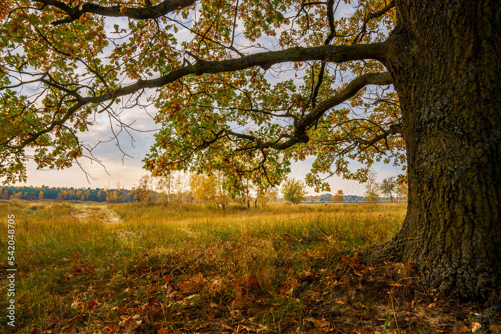 Samotne drzewo w jesiennych barwach. Jesienny krajobraz.