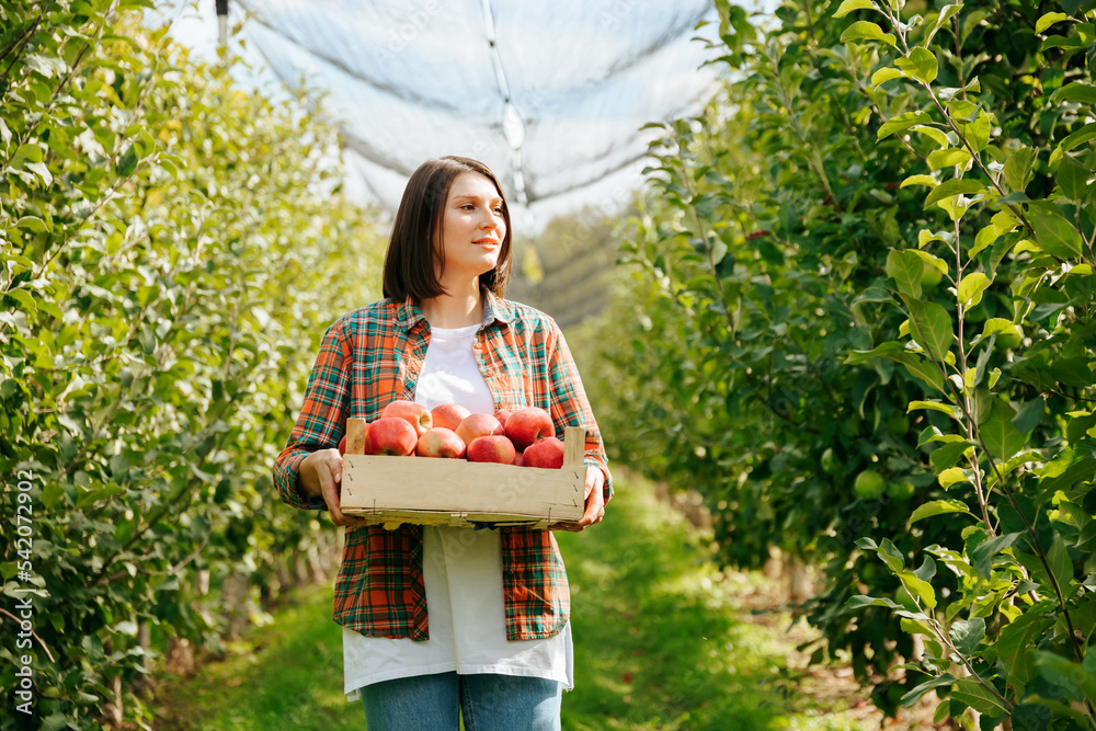 Front view looking away young farmer woman hold wooden box of ripe red apples staying in the garden. Lady orchard worker smile slightly looks happy. Harvest time, farming concept, apple trees around.