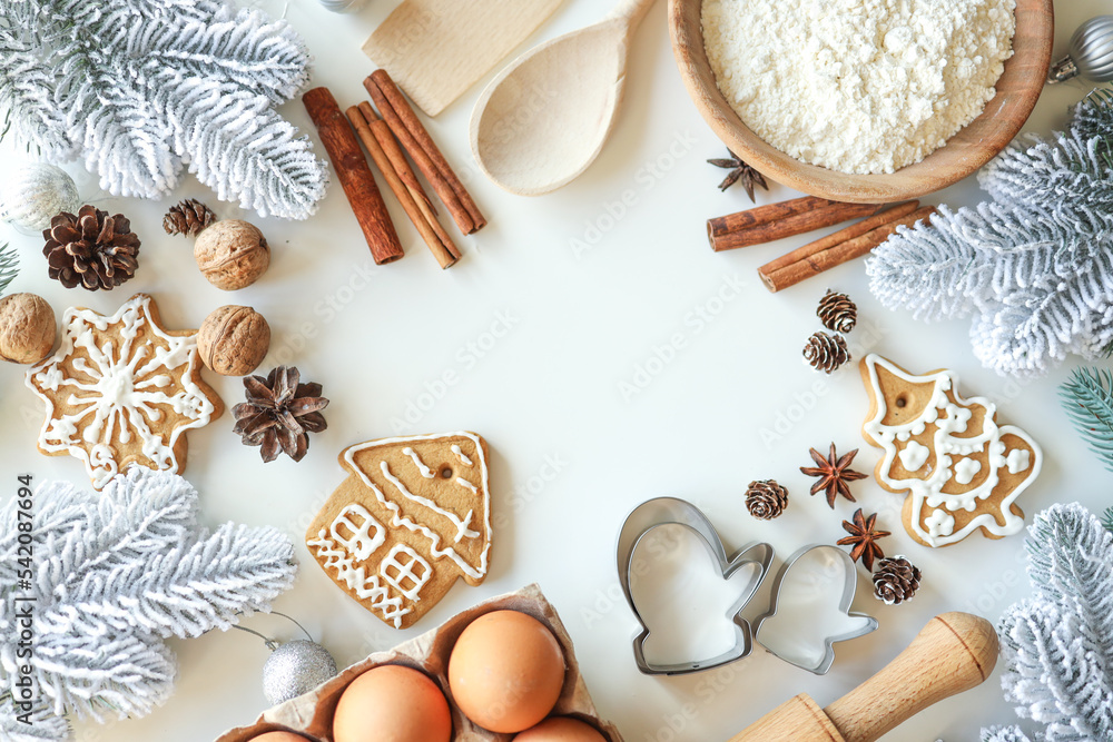 Bakery background with ingredients for cooking Christmas baking. Flour, eggs, cinnamon and gingerbread on the table top view