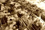 Fresh chopped and chunks tropical fruit packed in plastic box display on shelf at market stall. Convenience, healthy lifestyle eating.