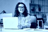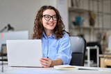 Young happy business woman company employee, marketing manager sitting at desk working on laptop. Pretty female professional worker using computer in corporate modern office looking away and smiling.