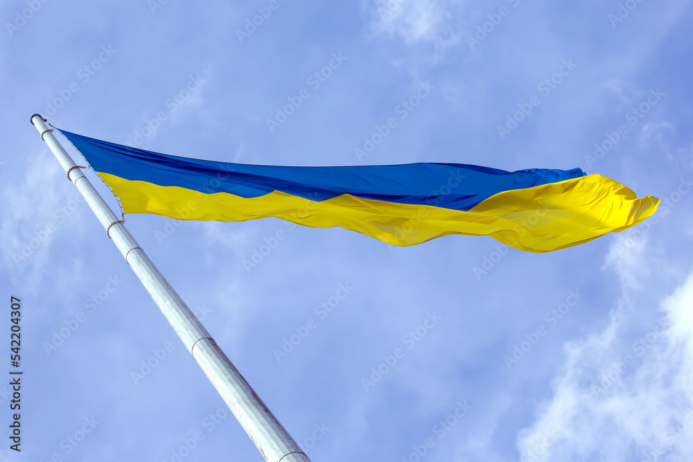 waving in the wind the national flag of Ukraine against the blue sky