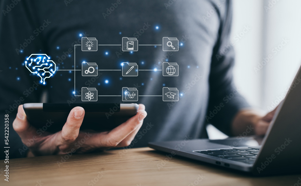 Businessman working or student studying by using laptop. Business or education intelligence workflow. Strategy planning and data and information analysis. Knowledge and cognition learning online
