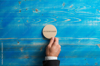 Wooden cut circle with an Internship word on it over a blue wooden background