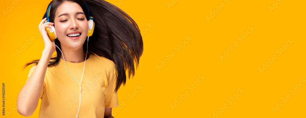 Happy beautiful asian young woman listening music in headphones and dancing on yellow background in happiness Beautiful young girl dancing She close eyes Copy space Expressive facial expressions