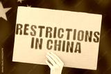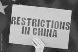 The phrase " Restrictions in China " is on a banner in men's hands with blurred background. Sanction. Conflict. Control. Independence. Law. Military. Password. Protection. Protest. Speak. Speech. War