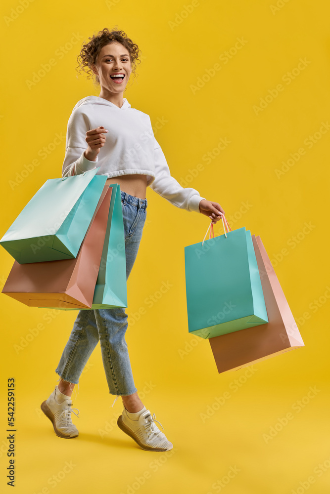 Side view of slim girl holding packages, walking, standing on toes. Pretty female wearing white khudi and jeans, smiling, looking at camera. Concept of youth and modern life.
