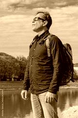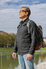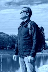 A male tourist with a backpack on his shoulders against the backdrop of a beautiful mountain landscape and old urban architecture. Concept: tourism and travel, retirement holidays.