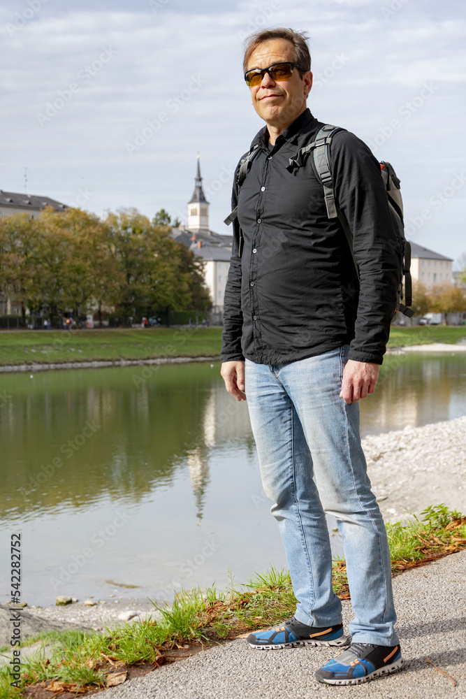 Male tourist 45-50 years old with a backpack on the background of a tourist mountain landscape and a river. Concept: travel in retirement, new places.