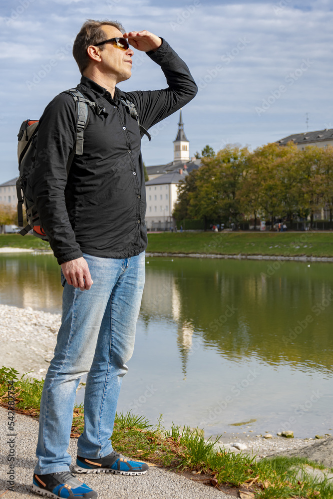 A male tourist with a backpack on his shoulders against the backdrop of a beautiful mountain landscape and old urban architecture. Concept: tourism and travel, retirement holidays.