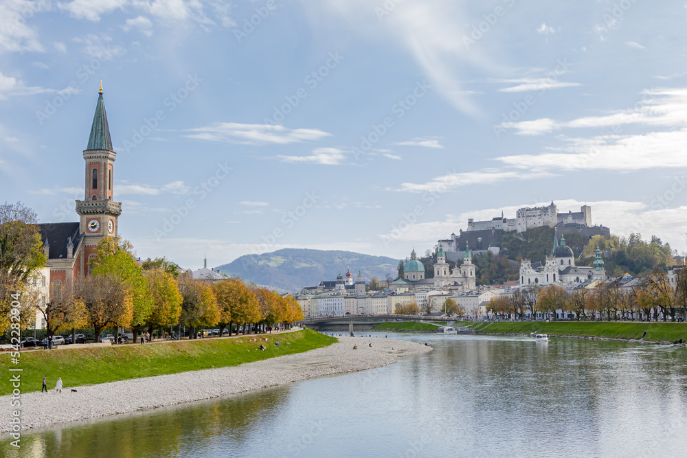 Salzburg Hohensalzburg fortress on the top of the mountain, the largest fortification in Europe, river; Austria, Salzburg,