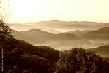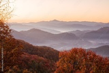 A beautiful sunrise near Great Smoky Mountains National Park. The trees are peak autumn colors and the sky has an orange glow. There is fog and haze in the distant valleys.