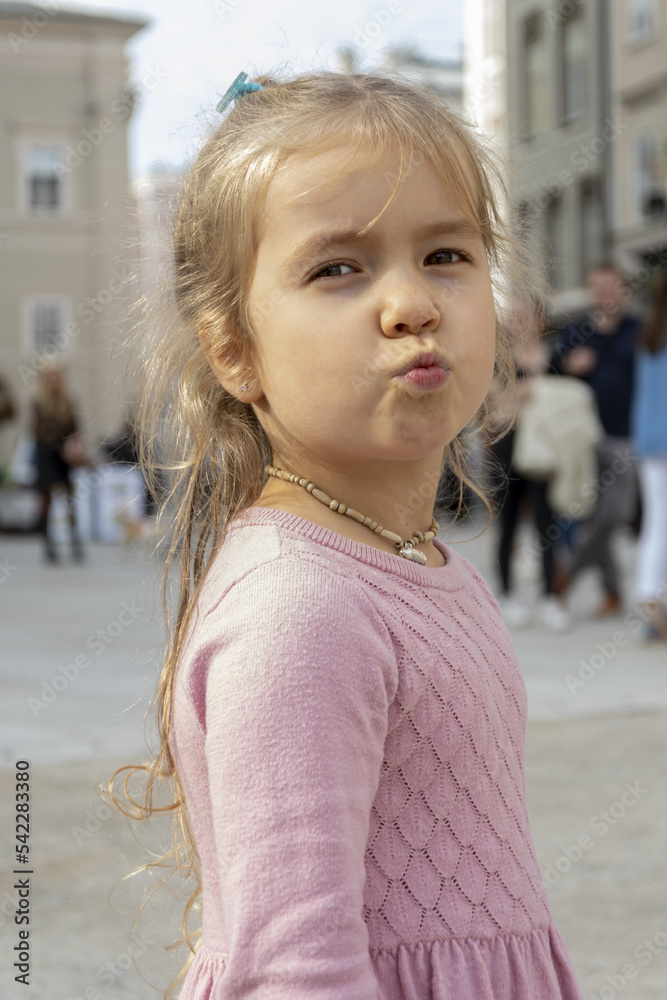 Street portrait Little girl 4-5 years old on a blurred urban background of old architecture..