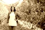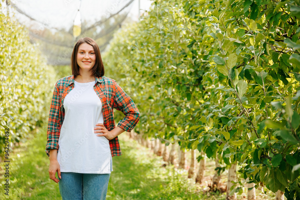 Front view looking at camera charming smile farmer woman short haircut stand in an apple orchard. A cute adult girl farmer beautifully holds her hand on her belt and smiles slightly. Copy space.