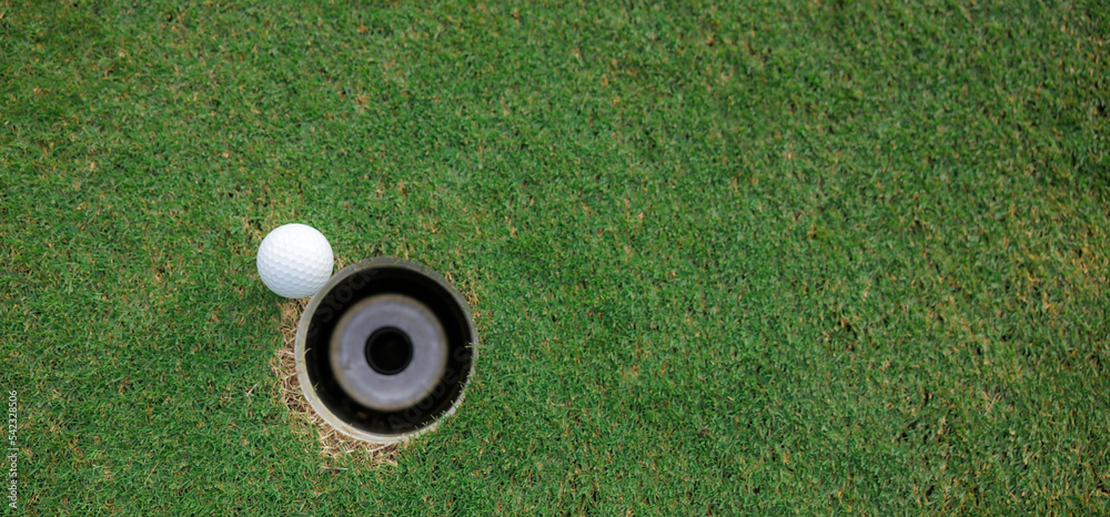 Top views white golf ball and golf hole on green grass texture background. coppy space
