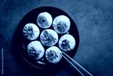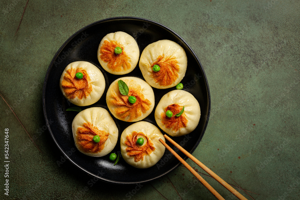 Xiao Long Bao or Baozi or Sheng Jian Bao, is a type of yeast-leavened meat filled buns, steamed and pan fried. Chinese dish. Directly above on a green surface, top view.