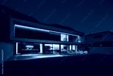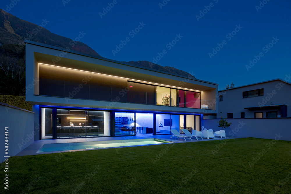 Modern house with swimming pool and garden in night scene illuminated by colored LED lights. Behind the house is the hill with the forest.