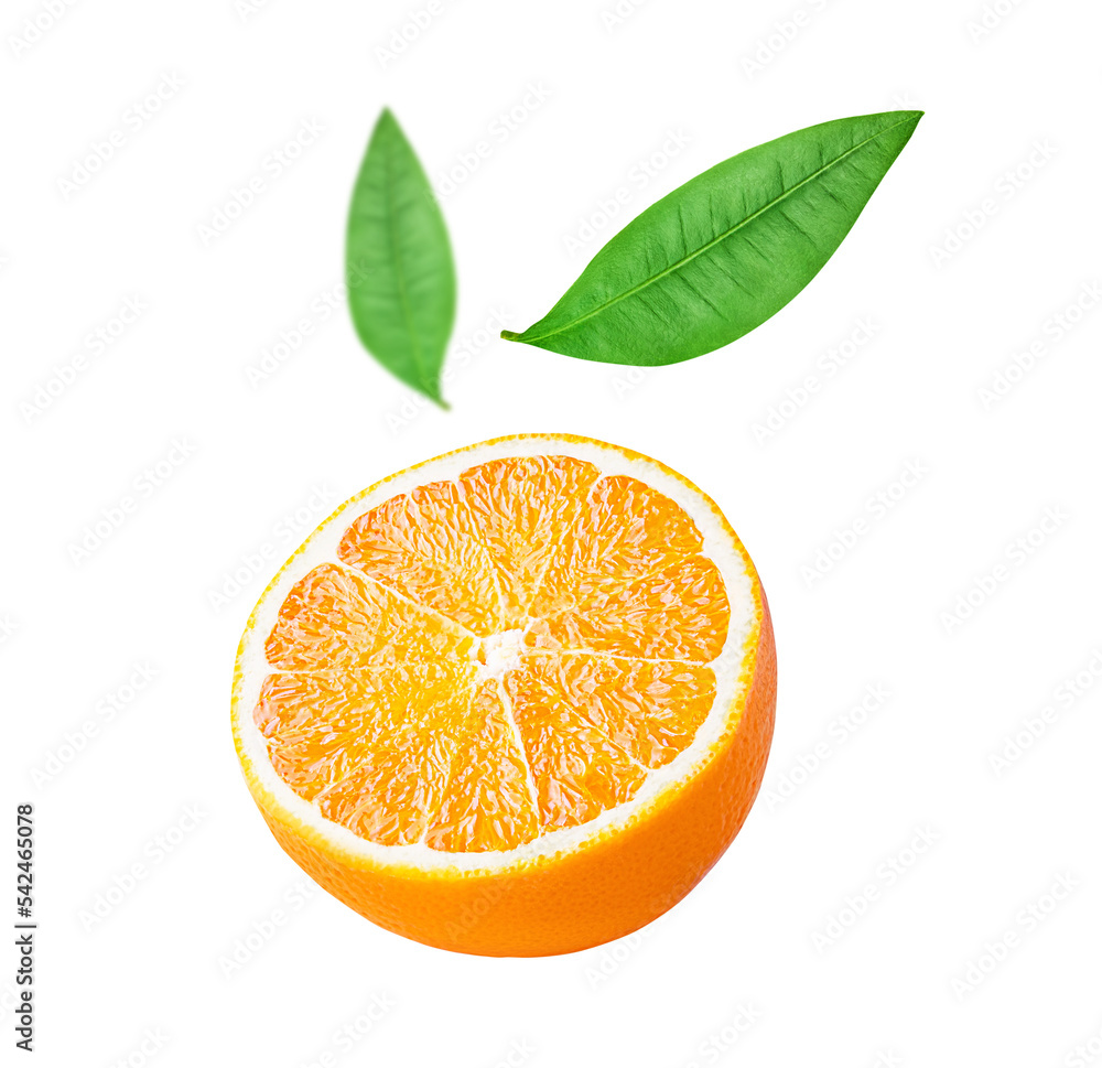Orange citrus fruit isolated on white or transparent background. One cut half of orange fruit with green leaves