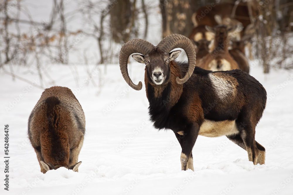 Two mouflon, ovis orientalis, standing on snowy meadow in winter nature. Pair of wild male sheeps looking to the camera on snow. Mammal with roundend horns watching on white pasture.