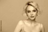 Portrait of a beautiful blonde girl with a short haircut. Gray background.
