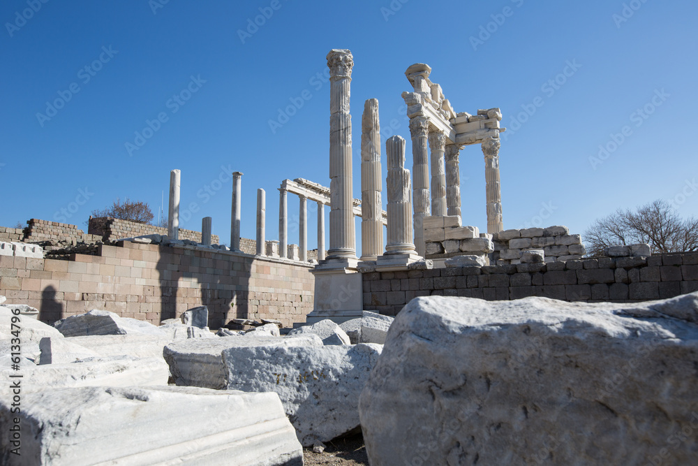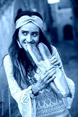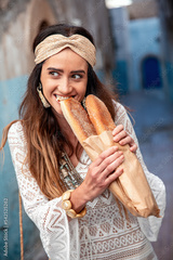 A girl in a white dress bites a delicious baguette. Essaouira. Morocco.