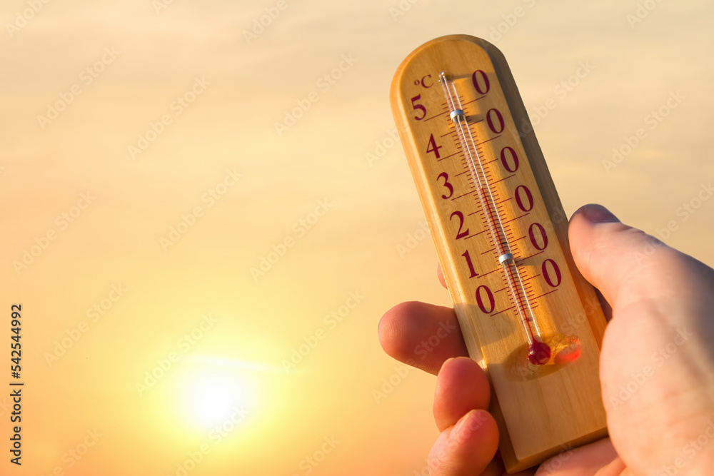 Thermometer for measuring temperature in nature against the background of the sky in the summer hot weather
