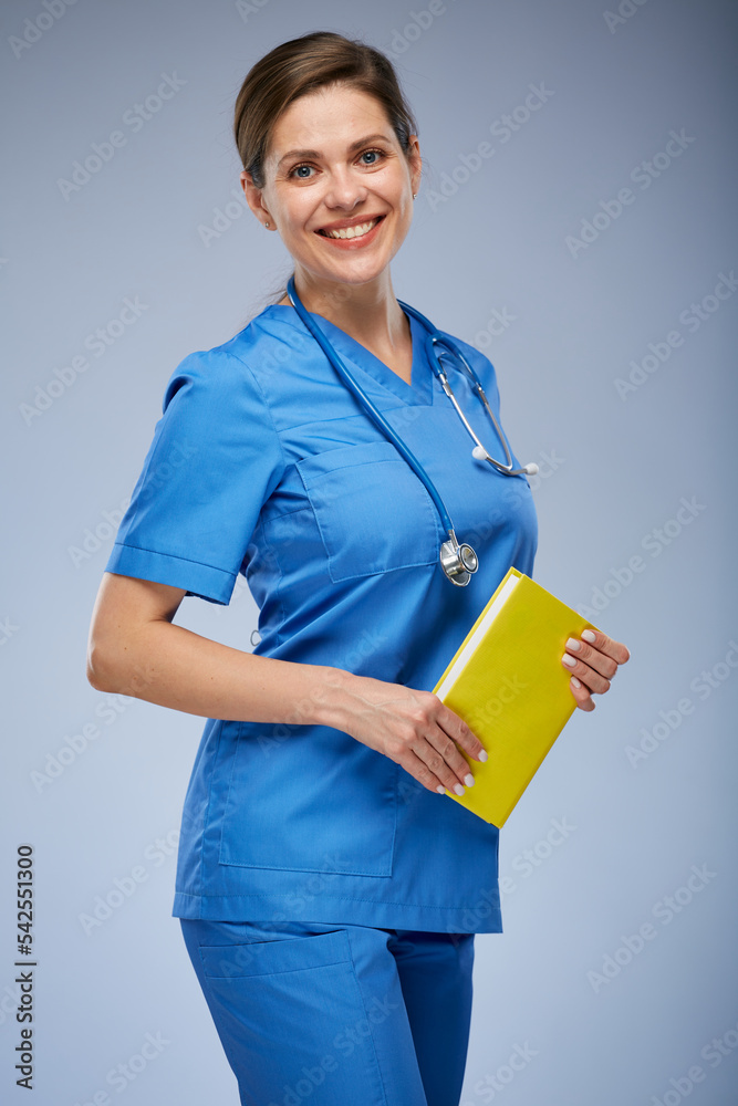 Teacher doctor or woman student standing in medical uniform with yellow book. Isolated portrait.