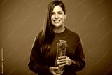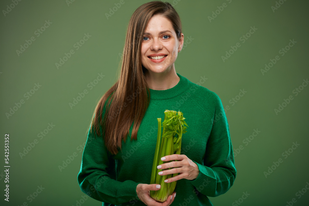 Smiling woman holding celery bunch. Advertising isolated portrait on green.
